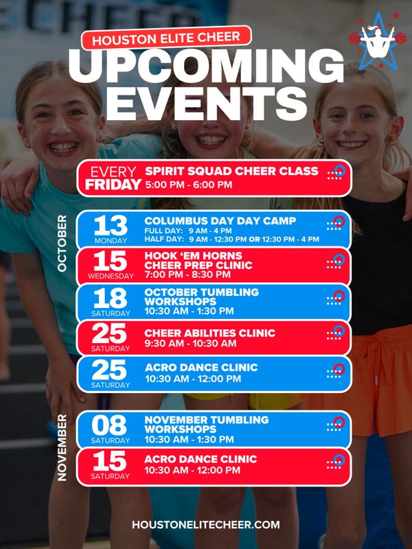 Mark your calendars! Houston Elite Cheer has an exciting lineup this fall! From tumbling workshops and acro dance clinics to cheer prep and spirit squad classes, there’s something for every athlete. Don’t miss your chance to train, grow, and shine, see you in the gym!
