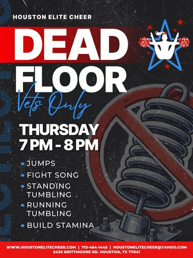 Houston Elite Cheer is excited to introduce Dead Floor (Veterans Only) a conditioning-based class designed to enhance jumps, fight song performance, tumbling, and overall stamina.