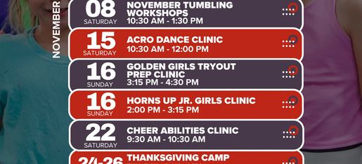 Mark your calendars!! Houston Elite Cheer has an incredible lineup waiting for you this fall, and we can’t wait to see our athletes in action. Whether you’re looking to sharpen your tumbling skills, perfect your performance in our acro dance clinics, get ahead with school cheer prep, or build confidence in our spirit squad classes, there’s a spot for YOU.