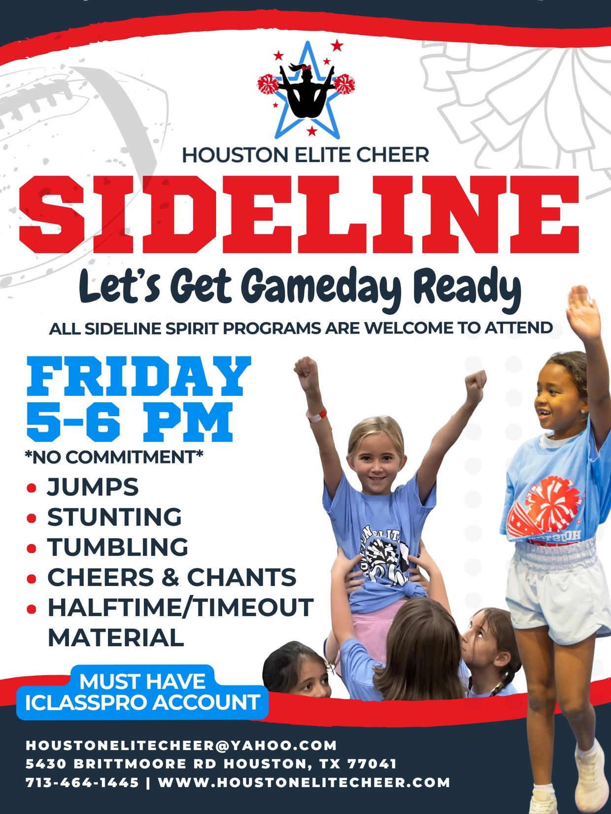 Our Sideline Class is designed to help athletes get gameday ready with skills that shine under the Friday night lights. Athletes will work on jumps, stunting, tumbling, cheers, chants, and halftime/timeout material in a fun, team-oriented environment.