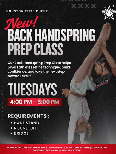 Our Back Handspring Prep Class is designed to help Level 1 athletes build the strength, technique, and confidence needed to successfully learn a back handspring. In this class, athletes will focus on drills, conditioning, and progressions that develop the proper body position, power, and control required for back handsprings. This class is a great step for athletes preparing to move into Level 2 tumbling. To ensure athletes are ready for this class, participants should already have strong foundational skills.