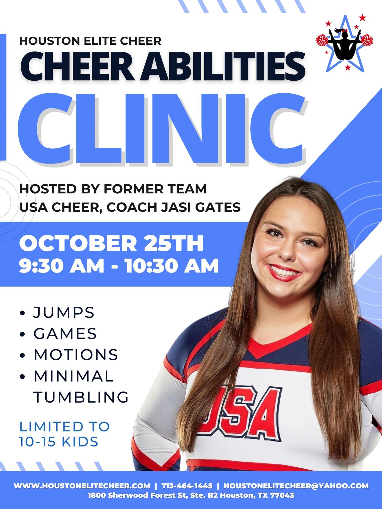 Mark your calendars! Houston Elite Cheer is hosting two exciting clinics on Saturday, October 25th! Join former Team USA cheerleader, Coach Jasi for our Cheer Abilities Clinic from 9:30–10:30 AM! After that, we’ll host our Acro Clinic from 10:30 AM–12:00 PM, where athletes can focus on building strength, flexibility, and learning new dance-based acro skills!