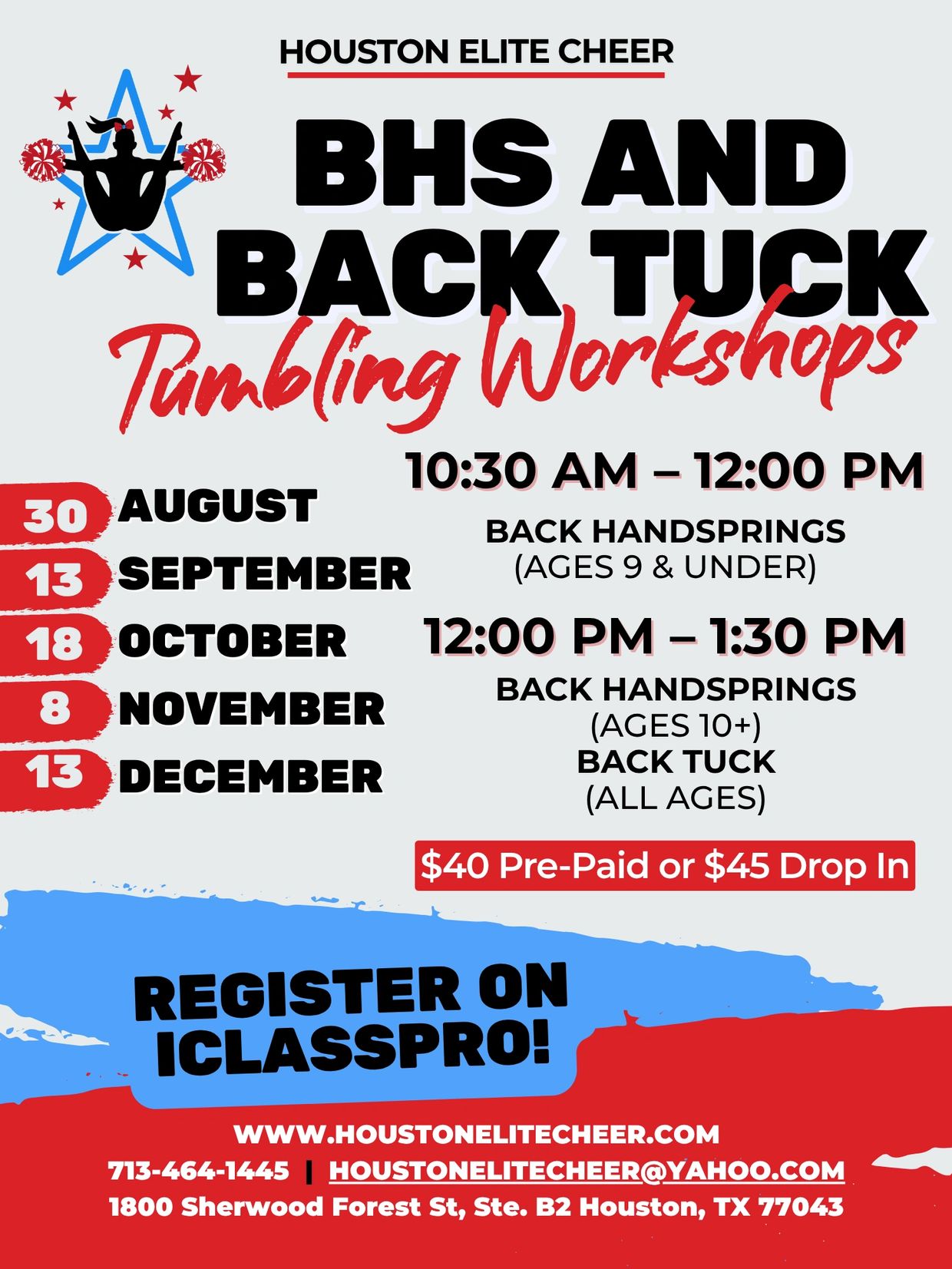 Don't miss this opportunity to take your tumbling and cheerleading to the next level. Sign up for our Back Handspring and Back Tuck Workshops today! Only at Houston Elite Cheer!