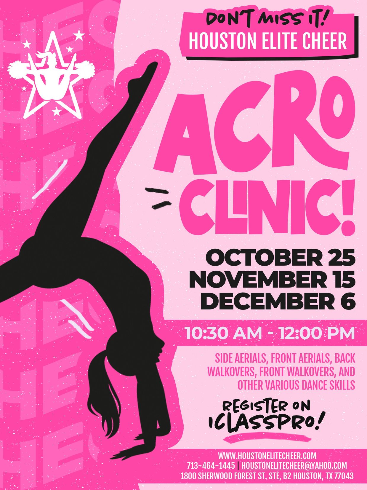 Ready to flip, fly, and take your skills to the next level? Houston Elite Cheer is excited to announce our Acro Clinic—happening this fall on October 25th, November 15th, and December 6th!